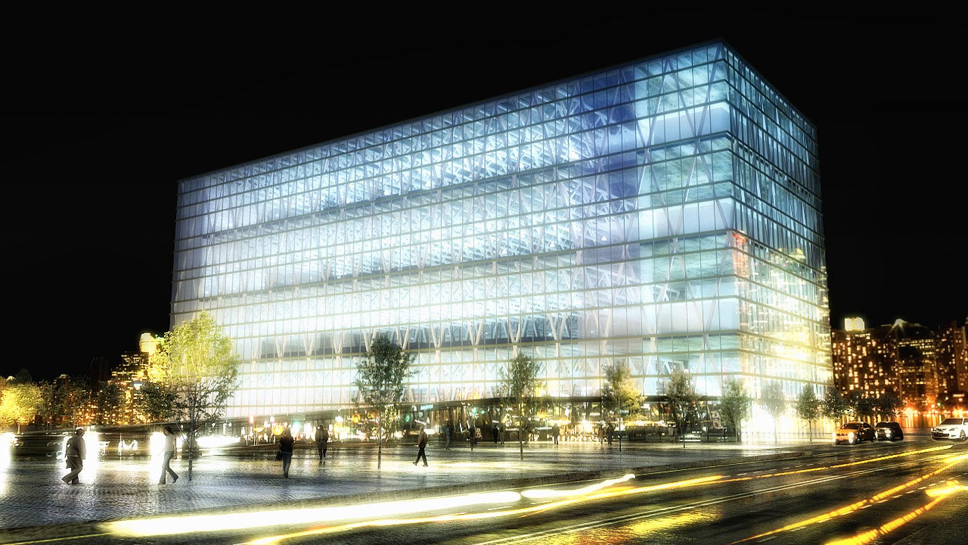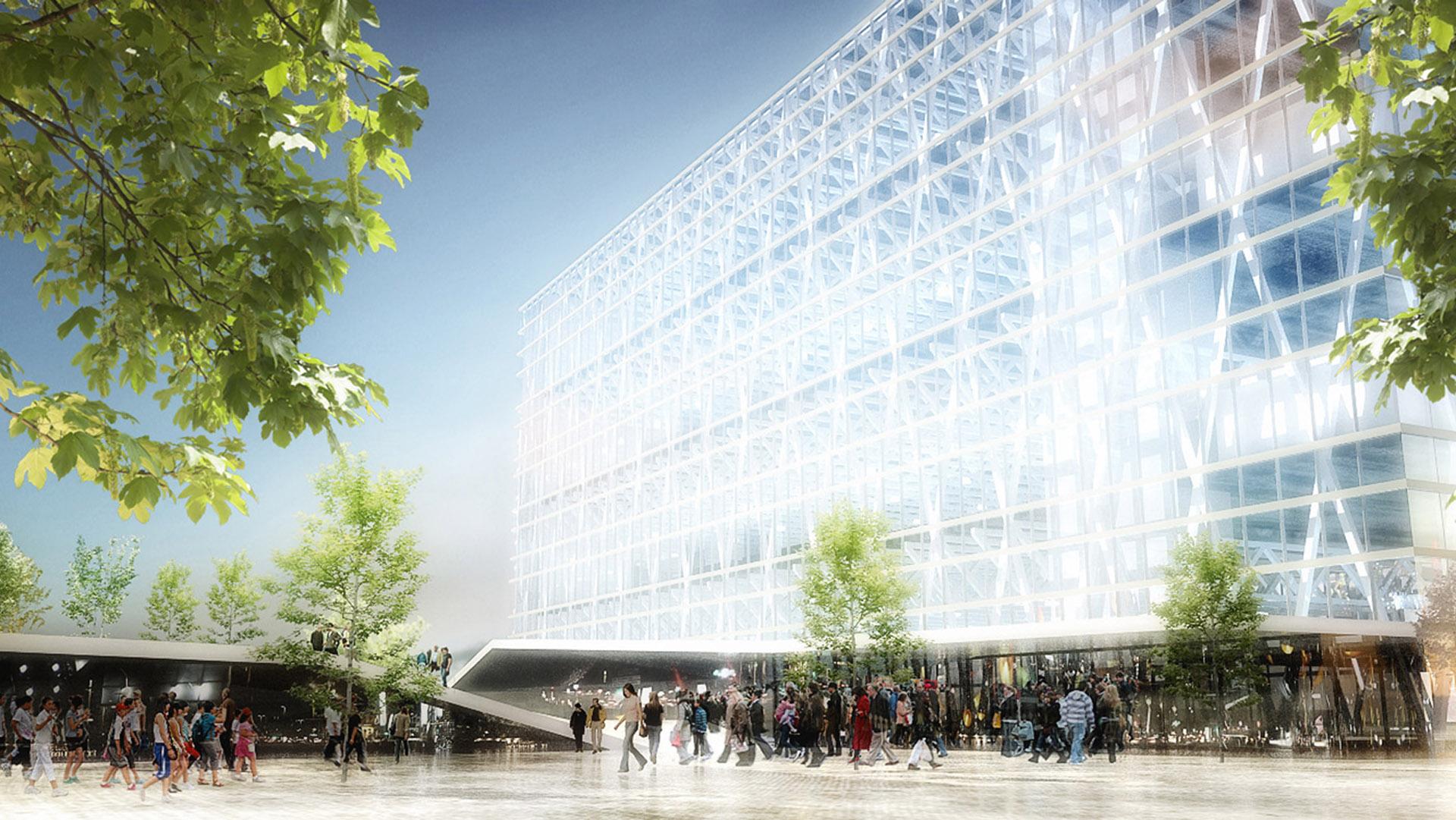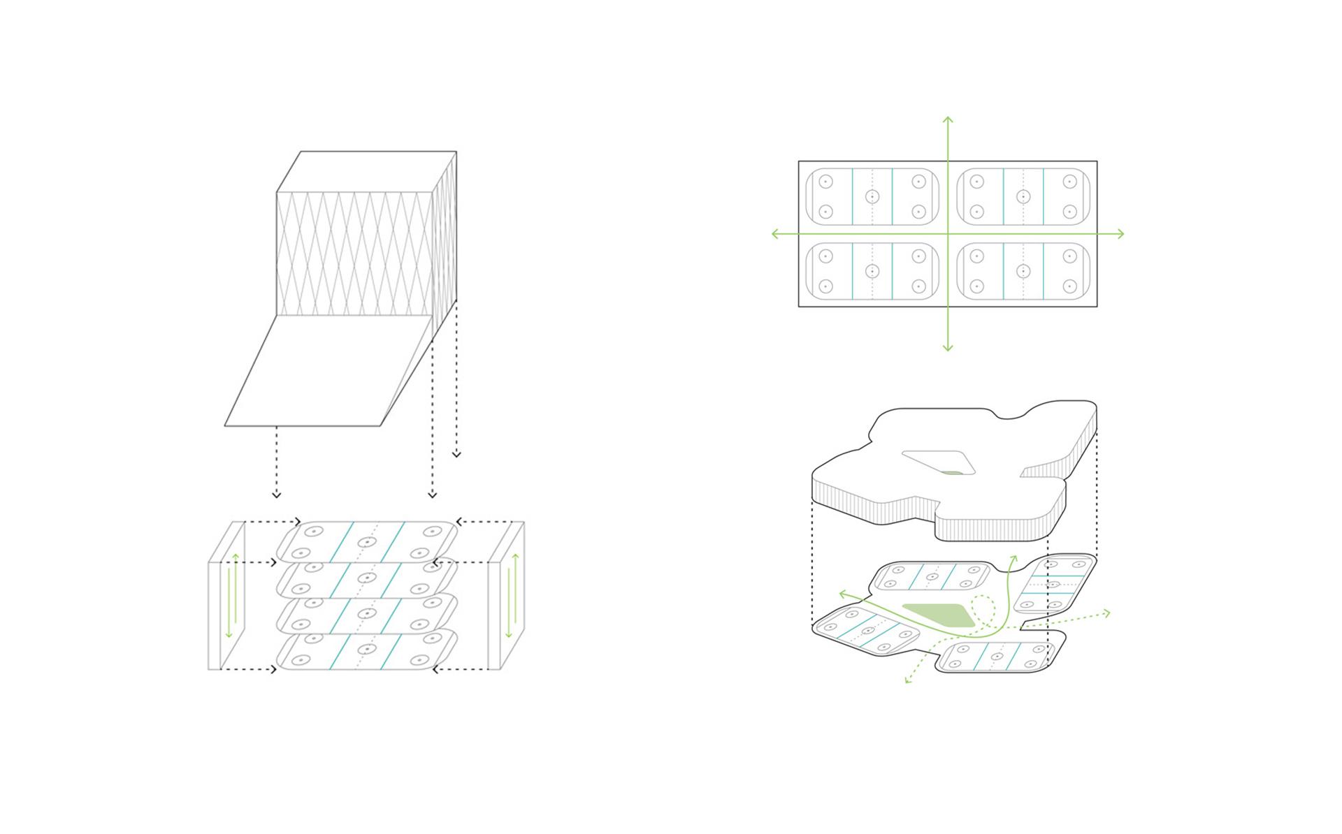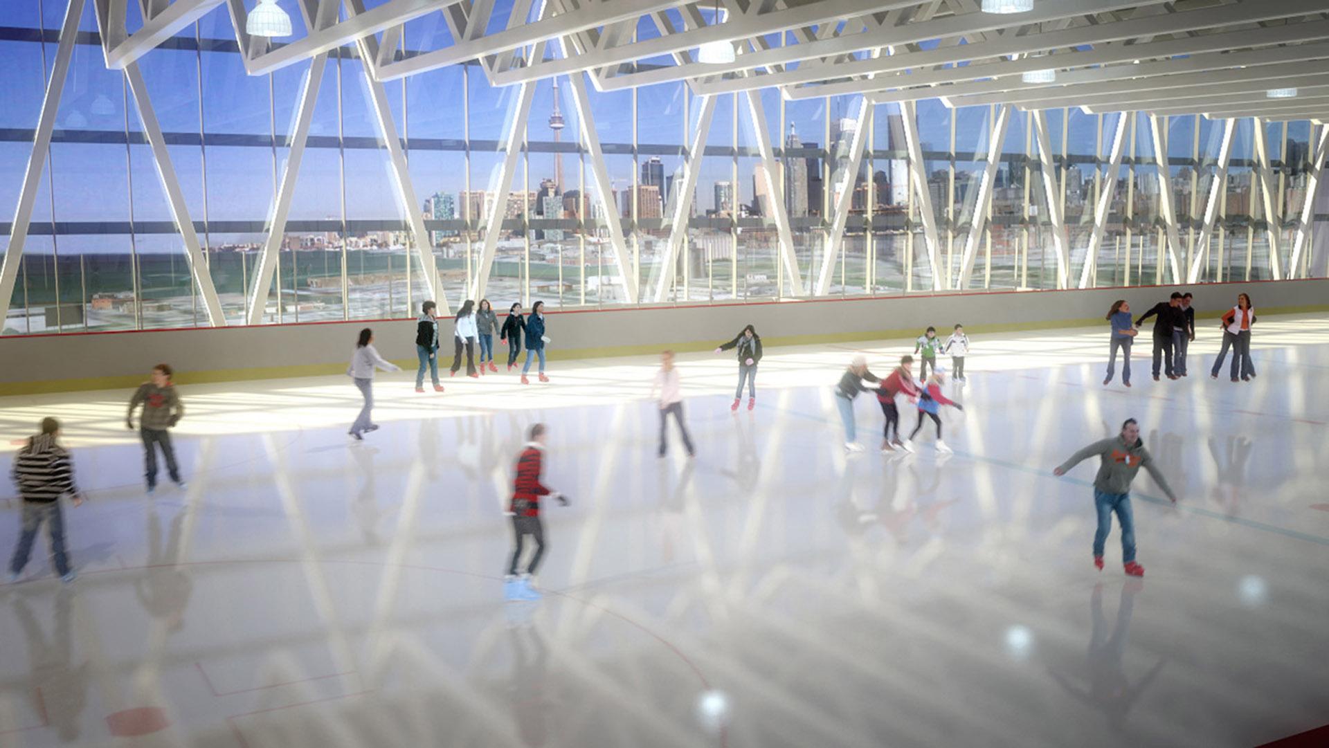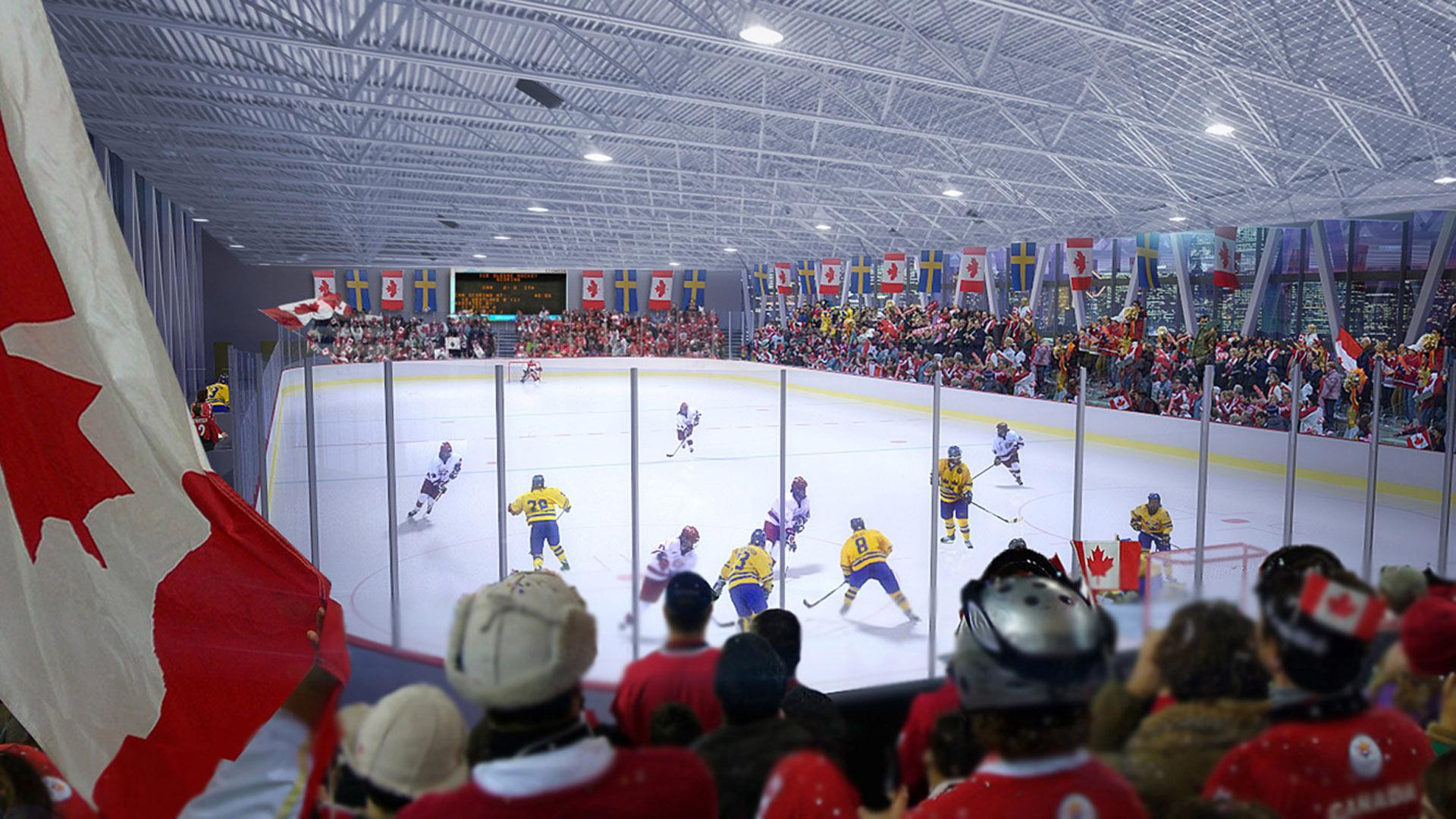 Two solutions were proposed: a traditional concept with four hockey arenas on the ground floor, and a vertical concept with four arenas stacked on top of each other. The vertical structure, in which the halls are located one above the other, has been proposed to leave space for further urban development. This concept also acts as a sports/urban landmark visible from the downtown. The horizontal concept follows the traditional layout of the four arenas with cross walkways. The difference is that in this concept the arenas are laid on the ground irregularly, twisted towards the site lines to form a landscape allowing more generous open public walkways, with a central open courtyard.